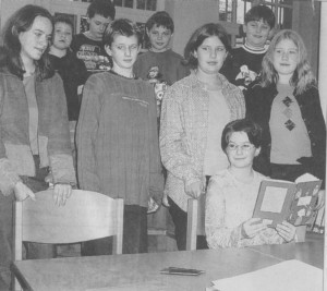Siegerinnen und andere Teilnehmer des Vorlese- wettbewerbes: Janine Sieraczewski (sitzend) und Denise Schiffers (2.v.r.) nach ihrer Kür in der Stadtbücherei. Foto: Aachener Zeitung.