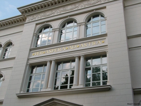 Front des alten Goethe-Gymnasiums am Kaiserplatz mit der allseits bekannten, goldenen Aufschrift "Per aspera ad astra".