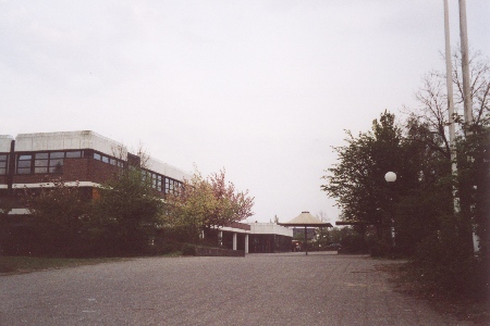 Der Schulhof mit seinen "Pilzen" von Norden betrachtet. Im Hintergrund liegt der Lehrerparkplatz.